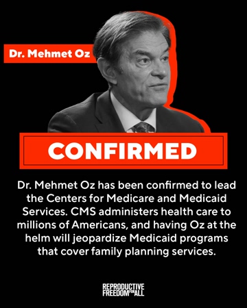 ‼️ Dr. Mehmet Oz has been confirmed to lead the Centers for Medicare and Medicaid Services. CMS administers health care to millions of Americans, and having Oz at the helm will jeopardize Medicaid programs that cover family planning services.